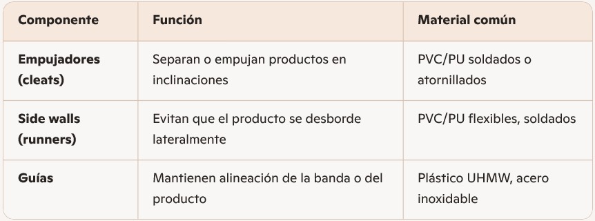 Las bandas transportadoras livianas con empujadores, guías laterales (side walls) y perfiles de guía están diseñadas para el transporte controlado de productos en trayectos inclinados o verticales. Fabricadas en PVC, PU o materiales modulares, permiten evitar el deslizamiento, mejorar la eficiencia del flujo y adaptarse a espacios reducidos. Son ideales para aplicaciones en industrias alimentarias, farmacéuticas y de empaque, cumpliendo con normativas sanitarias cuando se requiere. Los empujadores pueden ser termosoldados o atornillados, los side walls flexibles o rígidos, y las guías ajustables según el tipo de producto y proceso.