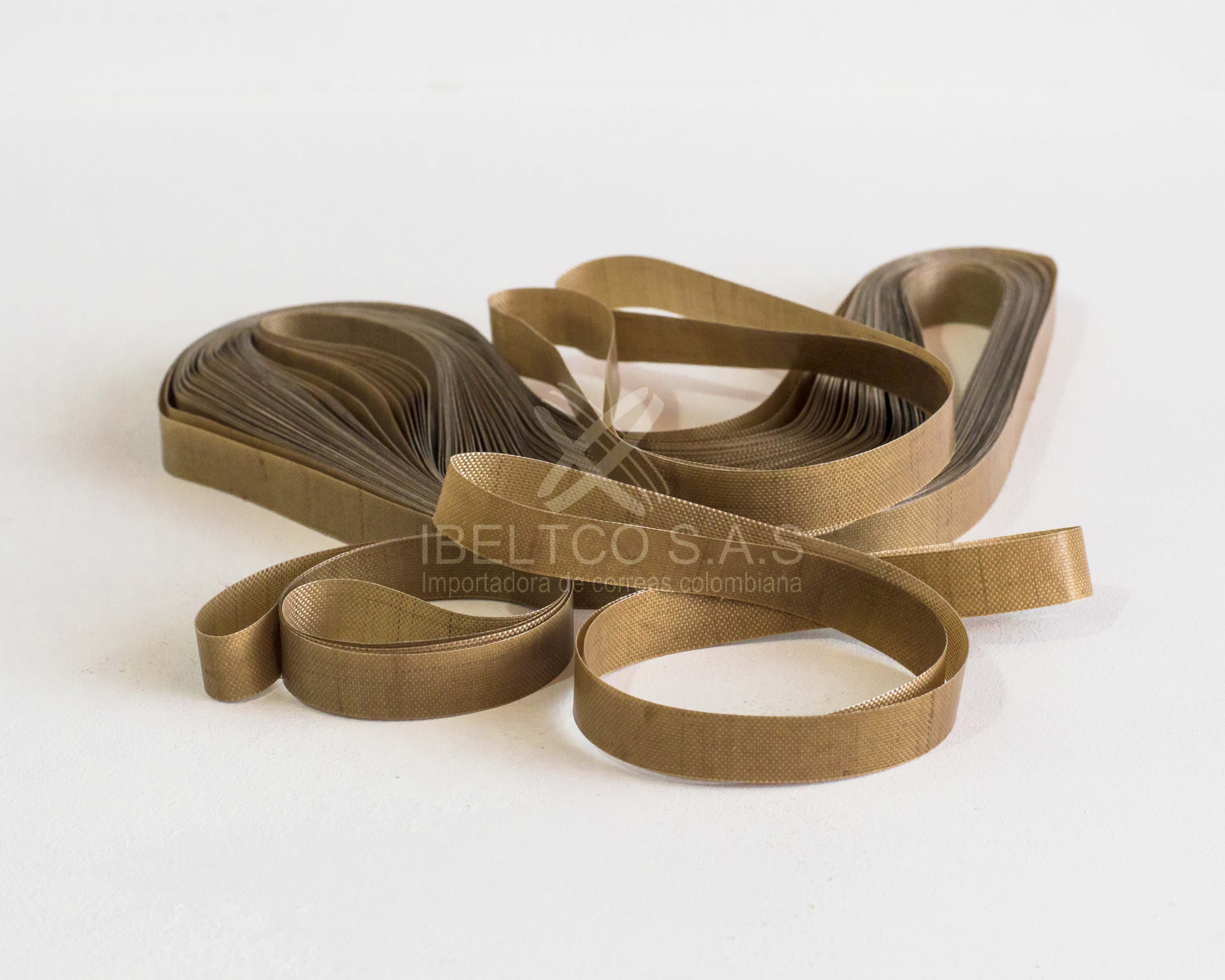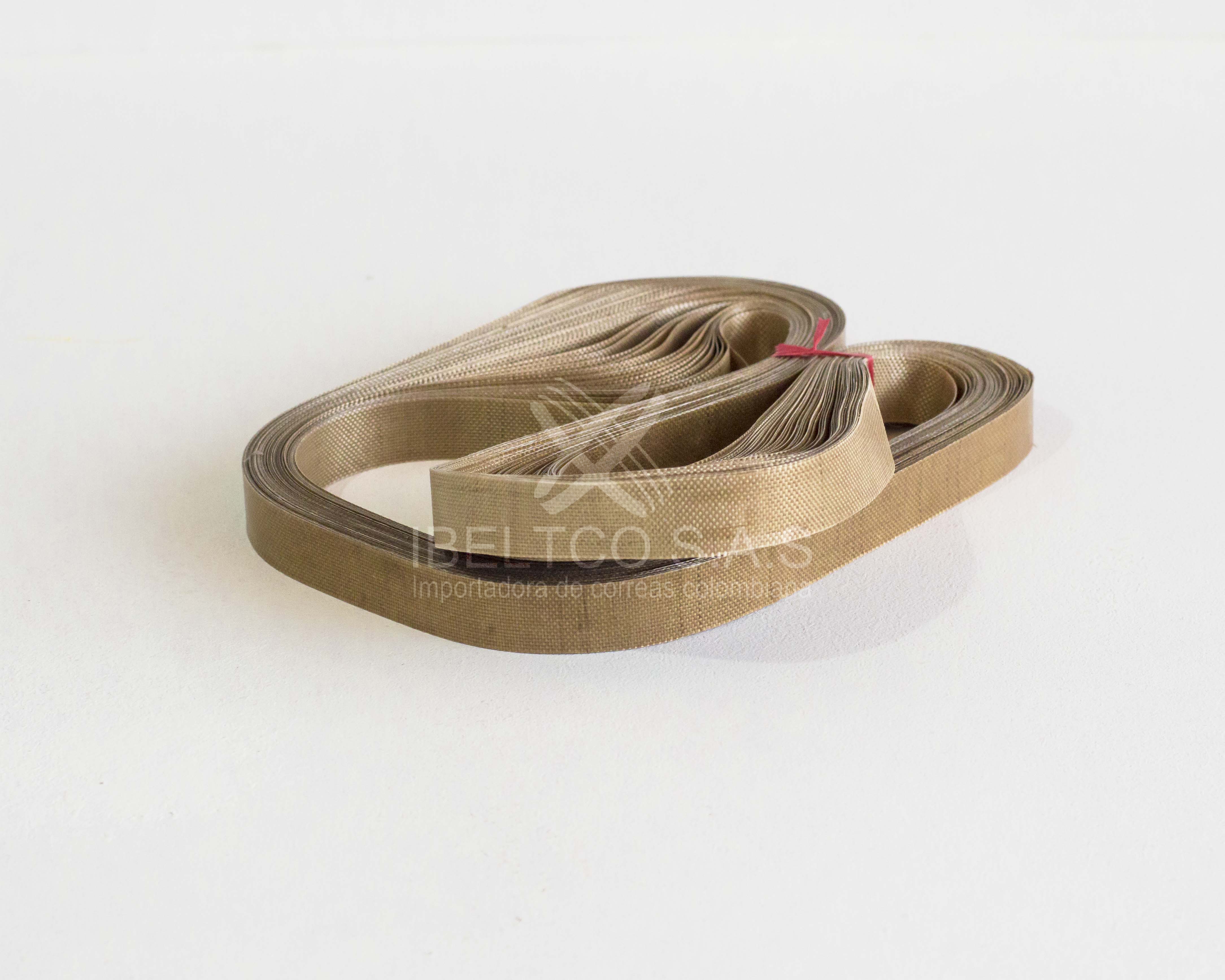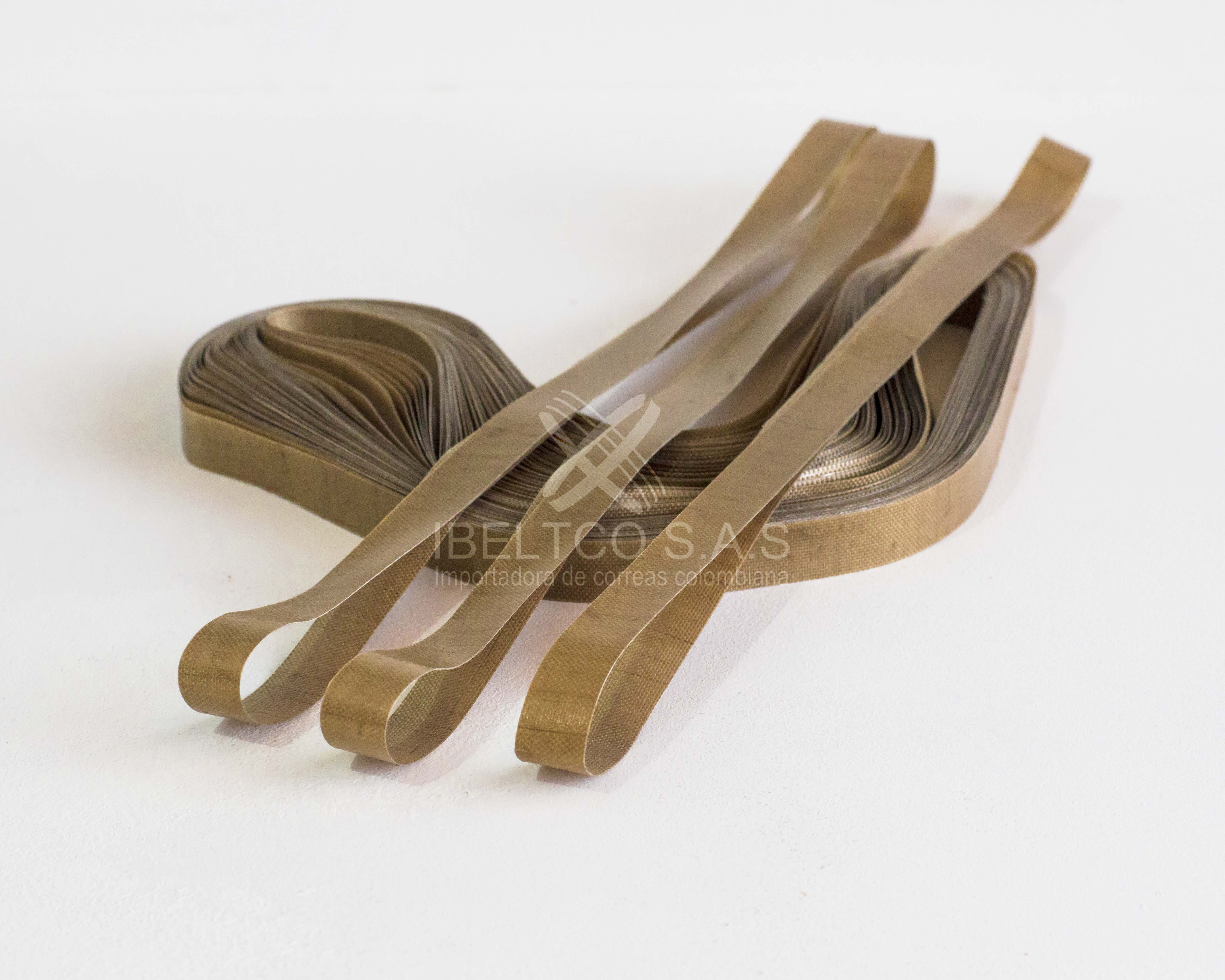 Bandas sin fin elaboradoras en teflón destinadas a soportar altas temperaturas. Tienen un promedio de 15 mm de ancho con el propósito de encajar en máquinas selladoras que trabajan con bolsas horizontales.