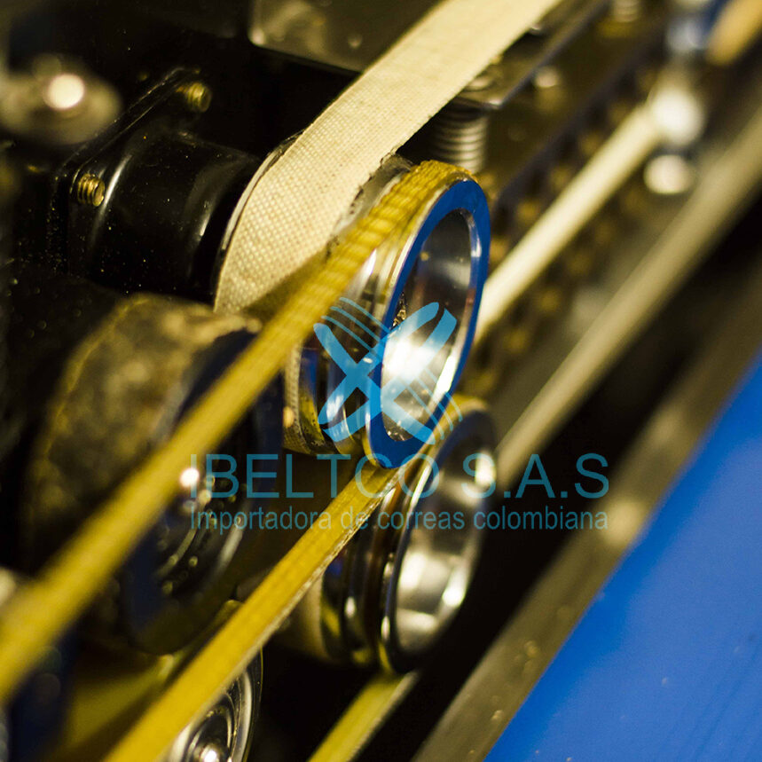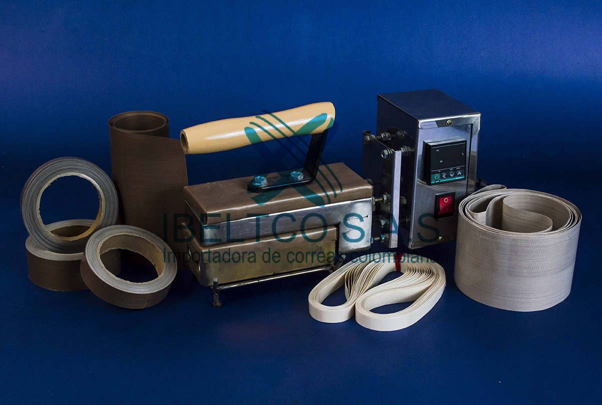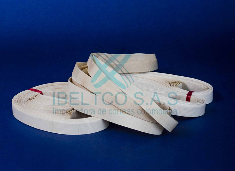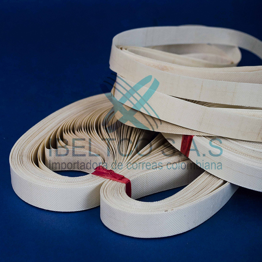 Bandas sin fin elaboradoras en teflón destinadas a soportar altas temperaturas. Tienen un promedio de 15 mm de ancho con el propósito de encajar en máquinas selladoras que trabajan con bolsas horizontales.
