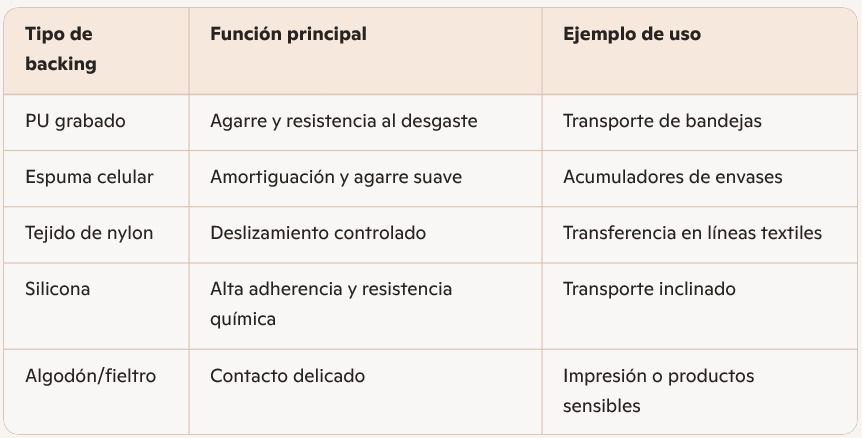 El backing es un recubrimiento aplicado sobre la superficie de la correa, que modifica su comportamiento según el tipo de producto transportado o el entorno de trabajo. Puede ser de poliuretano, goma, espuma, tejido o silicona, entre otros.