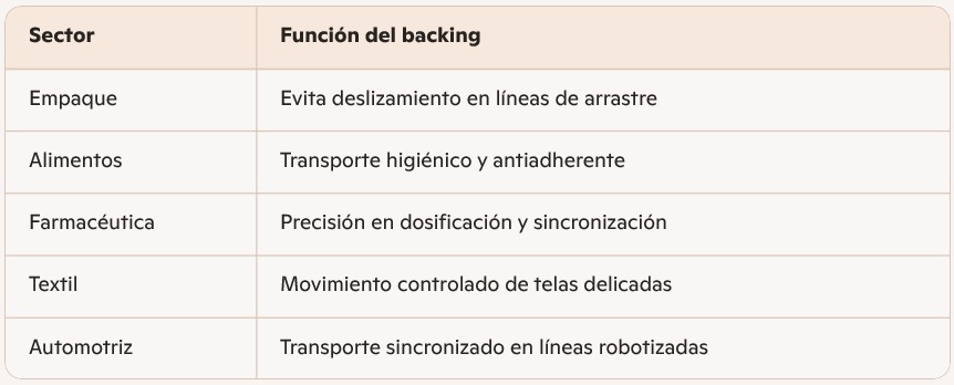 Las correas sincrónicas o planas con backing son soluciones de transmisión y transporte que combinan precisión mecánica con funcionalidad personalizada. Fabricadas en PU o caucho, incluyen un recubrimiento posterior (backing) que mejora el agarre, la resistencia térmica, la higiene o la protección del producto según el tipo de aplicación. Se utilizan en líneas automatizadas de empaque, alimentos, farmacéutica, textil y electrónica, donde se requiere sincronización perfecta y contacto controlado con el producto.